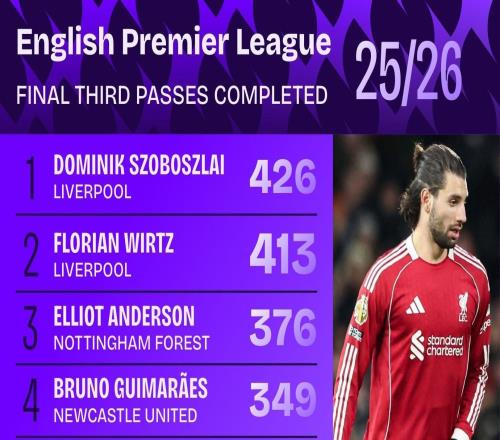 周三,知名数据机构Squawka统计了本赛季英超进攻三区成功传球数据,索博斯洛伊、维尔茨位列前二,利物浦有4人进榜...