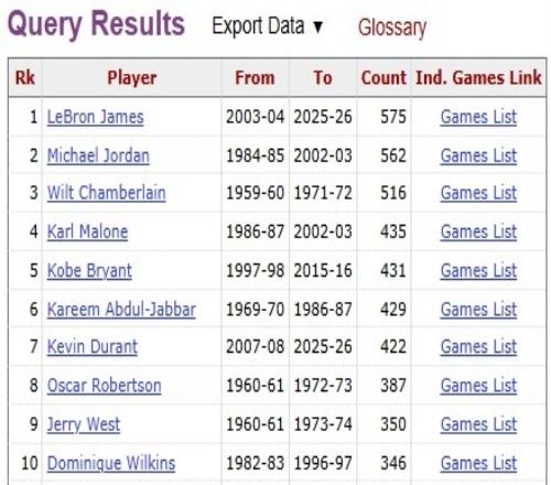 杜兰特423次砍下30+高居历史第7继续追赶贾巴尔詹姆斯575次第一