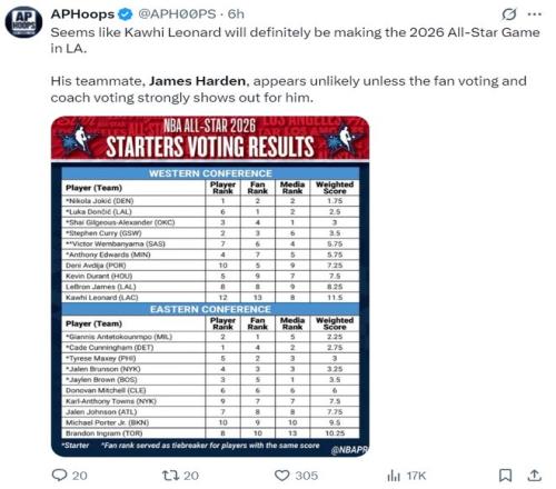 但算上球员投票,小卡最终是排在第十,而哈登则无缘全明星前十,换言之小卡入选全明星替补阵容很稳,而哈登就算入选全明星替补阵容都还不够稳健,哈登还需要得到西部主教练的认可才有希望在本赛季进入全明星。