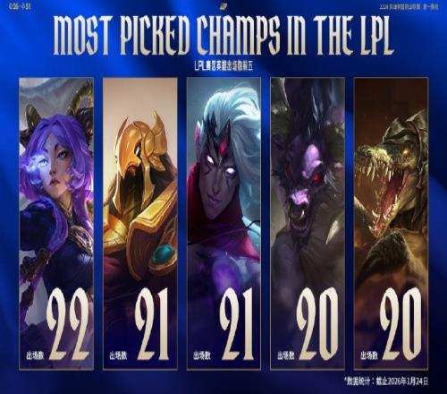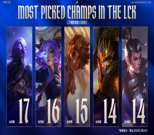 LPL赛区和LCK赛区英雄出场前五,芸阿娜分别以22次位列LPL赛区英雄出场第一,16次位列LCK赛区英雄出场第二;