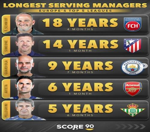 体育播报1月25日宣 数据网站Score90盘点了五大联赛球队现任主帅最长执教时长榜单,具体如下: