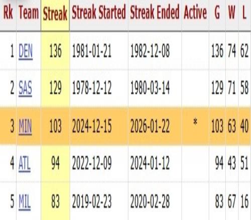 据统计,森林狼此前连续103场比赛得分破百(从2024年12月16日-2026年1月23日),历史第三高,他们的无缘追历史前二(掘金136场、马刺129场)。