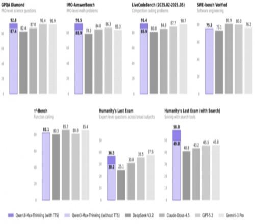 体育播报1月28日宣 近日,阿里正式发布千问旗舰推理模型Qwen3-Max-Thinking,创下数项权威评测全球新纪录,性能媲美GPT-5.2、Gemini 3 Pro,成为迄今为止最接近国际顶尖模型的国内最强AI大模型。通过总参数、强化学习、推理计算的极致规模扩展,千问新模型实现了性能的大幅飞跃,刷新科学知识(GPQA Diamond)、数学推理(IMO-AnswerBench)、代码编程(LiveCodeBench)等多项关键性能基准测试的全球纪录。